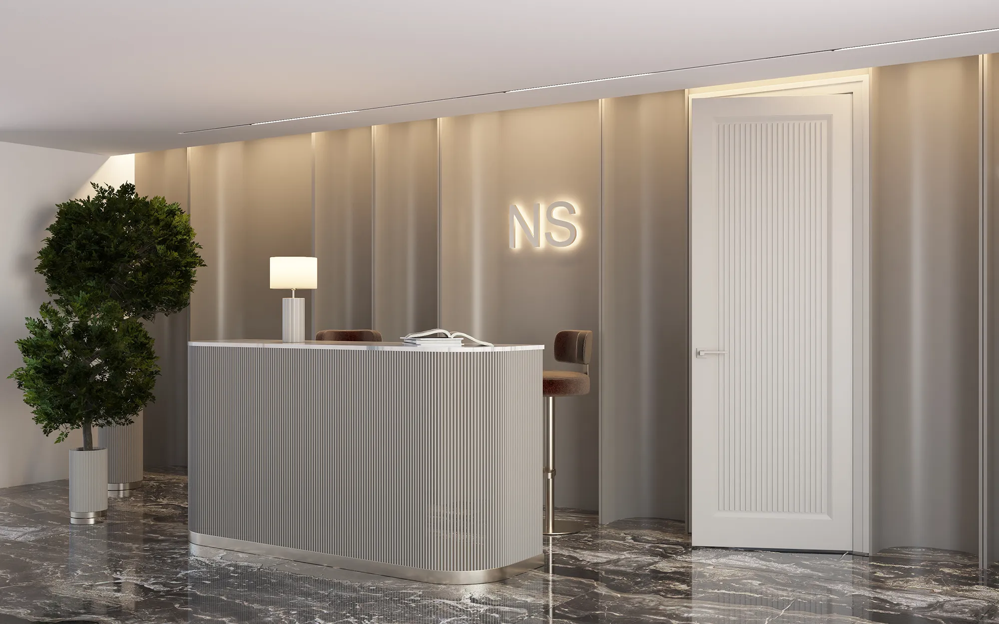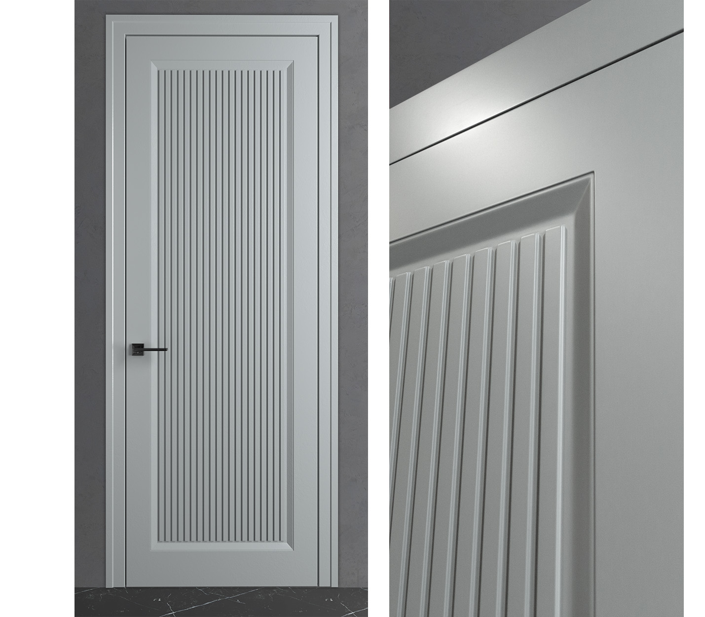 Для оформления интерьеров в современном стиле: полотно глухой конструкции с вертикальной фрезеровкой выглядит просто и интересно одновременно. Двери могут быть окрашены в любой цвет по каталогам RAL и NCS.