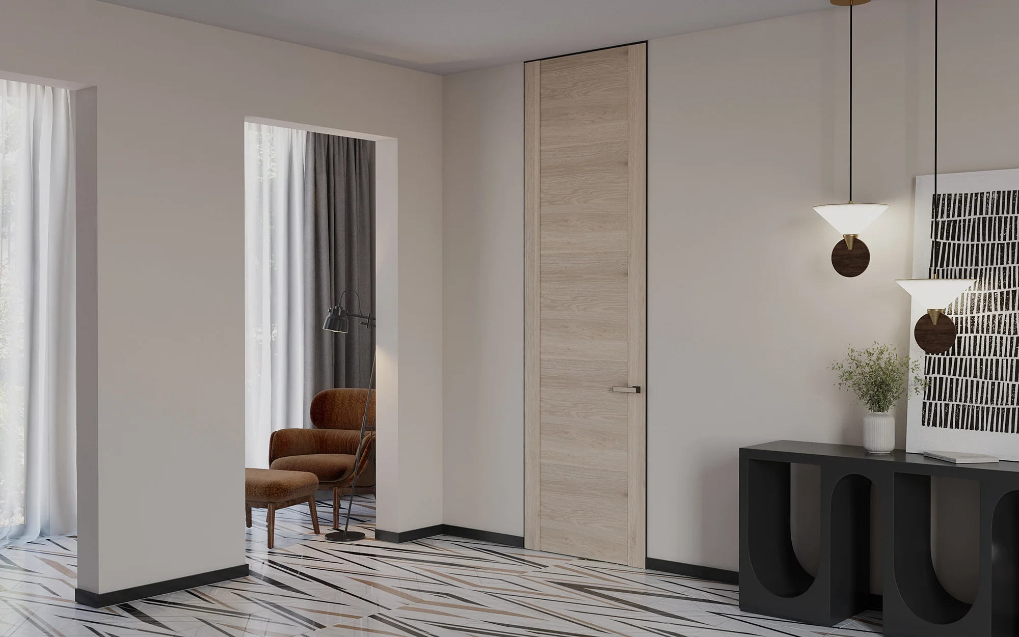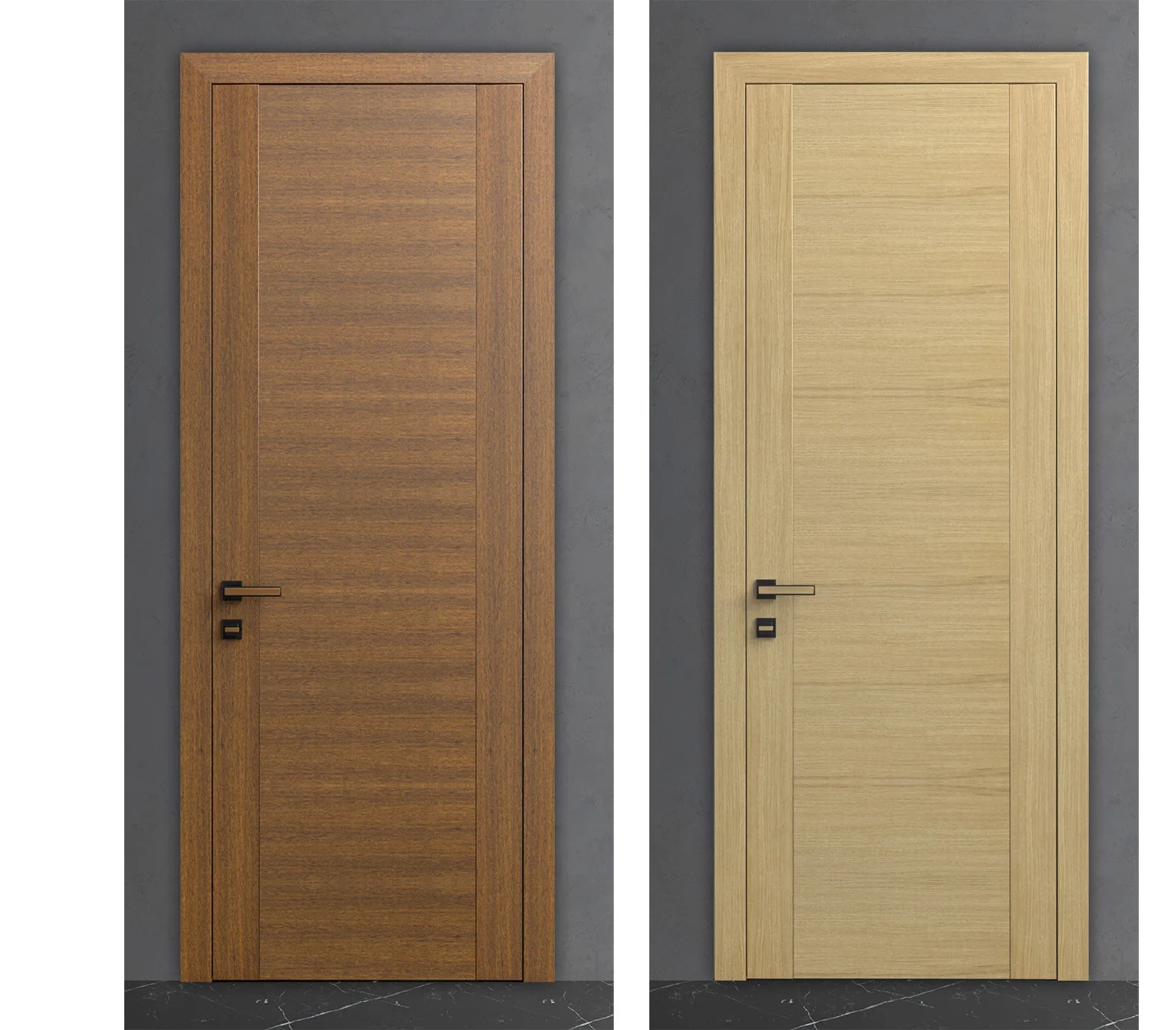 Глухая дверь Б4 с вертикальной фрезеровкой и комбинированной раскладкой шпона. Вертикальные линии зрительно вытягивают полотно в высоту.